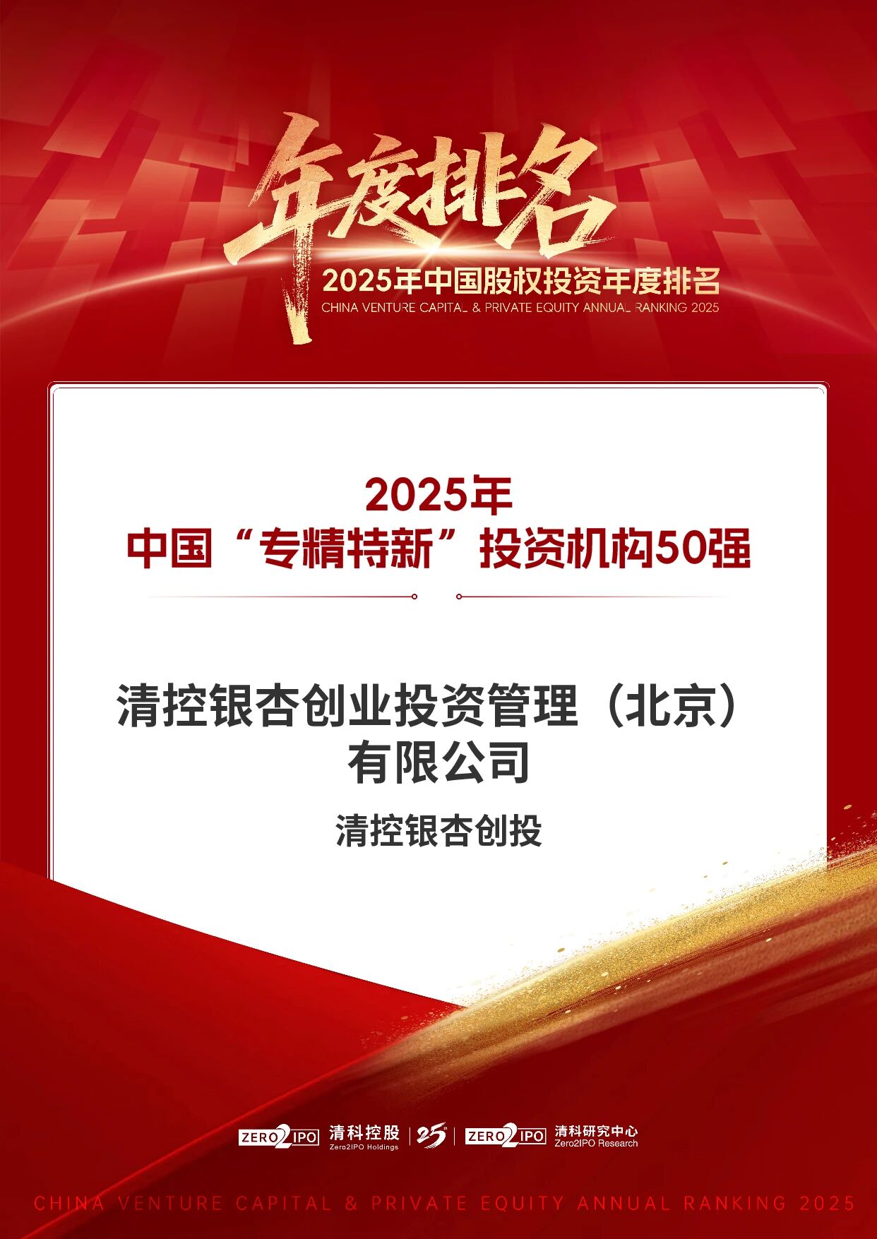 近日,由清科研究中心发起的2025中国股权投资年度排名正式揭晓,清控银杏凭借在早期科技投资领域的深厚积淀与卓越业绩,一举斩获“2025年中国创业投资机构50强”及“2025年中国‘专精特新’投资机构50强”两项殊荣。